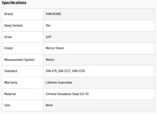 KINCROME K26550 SOCKET DEEP 3/8DR 8MM (MP)
