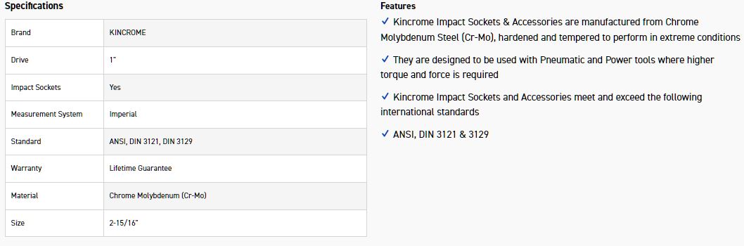 Kincrome Impact Sockets & Accessories are manufactured from Chrome Molybdenum Steel (Cr-Mo), hardened and tempered to perform in extreme conditions