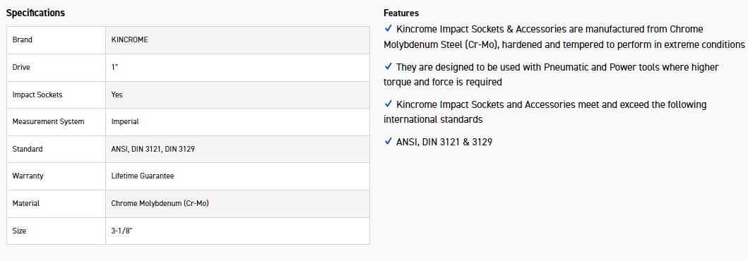 Kincrome Impact Sockets & Accessories are manufactured from Chrome Molybdenum Steel (Cr-Mo), hardened and tempered to perform in extreme conditions