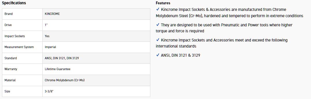 Kincrome Impact Sockets & Accessories are manufactured from Chrome Molybdenum Steel (Cr-Mo), hardened and tempered to perform in extreme conditions