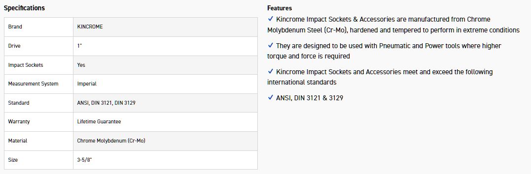 Kincrome Impact Sockets & Accessories are manufactured from Chrome Molybdenum Steel (Cr-Mo), hardened and tempered to perform in extreme conditions