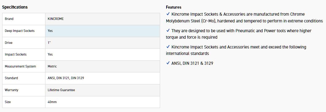 Kincrome Impact Sockets & Accessories are manufactured from Chrome Molybdenum Steel (Cr-Mo), hardened and tempered to perform in extreme conditions