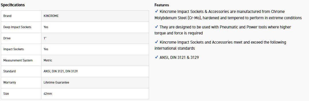Kincrome Impact Sockets & Accessories are manufactured from Chrome Molybdenum Steel (Cr-Mo), hardened and tempered to perform in extreme conditions