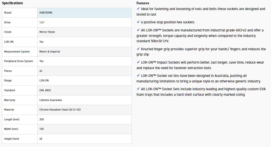 Kincrome LOK-ON™ Sockets, Sets and Accessories have been engineered beyond world-class benchmarks, exceeding all international torque and lifetime standards. Offering unique patented features such as the LOK-ON™ Socket’s ability to loosen up to 85% rounded/damaged fasteners, the LOK-ON™ range has been developed with both function and style in mind. Each component within the LOK-ON™ range includes features above and beyond the market’s expectation, setting a new benchmark for the professional quality tool industry.