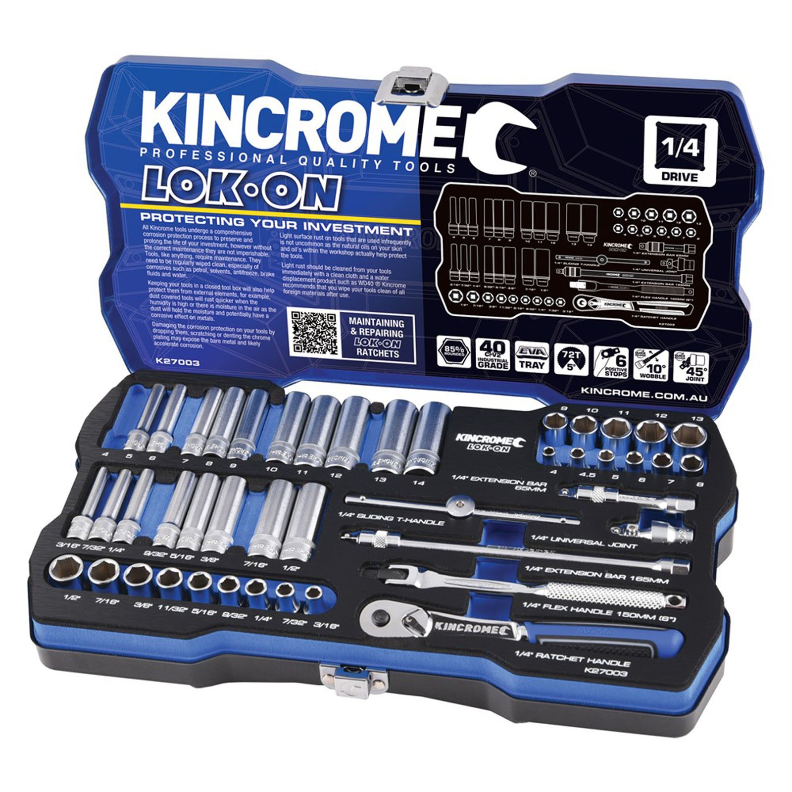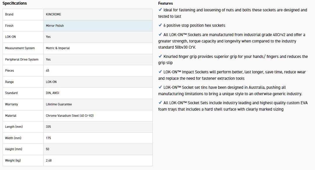 Kincrome LOK-ON™ Sockets, Sets and Accessories have been engineered beyond world-class benchmarks, exceeding all international torque and lifetime standards. Offering unique patented features such as the LOK-ON™ Socket’s ability to loosen up to 85% rounded/damaged fasteners, the LOK-ON™ range has been developed with both function and style in mind. Each component within the LOK-ON™ range includes features above and beyond the market’s expectation, setting a new benchmark for the professional quality tool industry