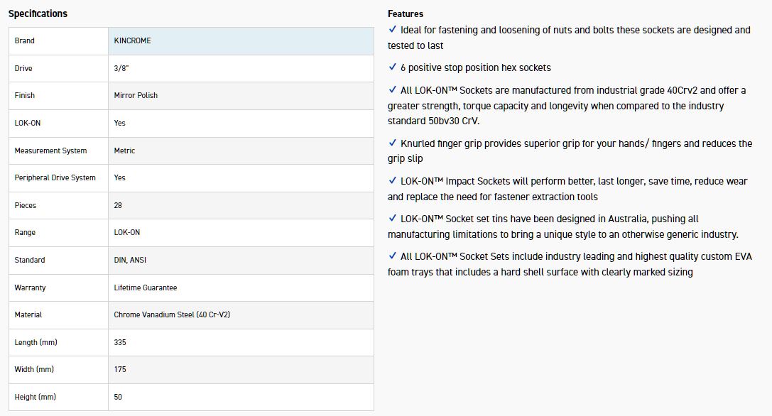 Kincrome LOK-ON™ Sockets, Sets and Accessories have been engineered beyond world-class benchmarks, exceeding all international torque and lifetime standards. Offering unique patented features such as the LOK-ON™ Socket’s ability to loosen up to 85% rounded/damaged fasteners, the LOK-ON™ range has been developed with both function and style in mind. Each component within the LOK-ON™ range includes features above and beyond the market’s expectation, setting a new benchmark for the professional quality tool industry.