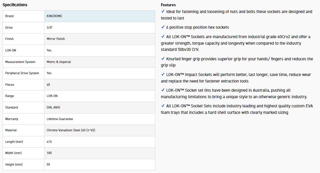 Kincrome LOK-ON™ Sockets, Sets and Accessories have been engineered beyond world-class benchmarks, exceeding all international torque and lifetime standards. Offering unique patented features such as the LOK-ON™ Socket’s ability to loosen up to 85% rounded/damaged fasteners, the LOK-ON™ range has been developed with both function and style in mind. Each component within the LOK-ON™ range includes features above and beyond the market’s expectation, setting a new benchmark for the professional quality tool industry