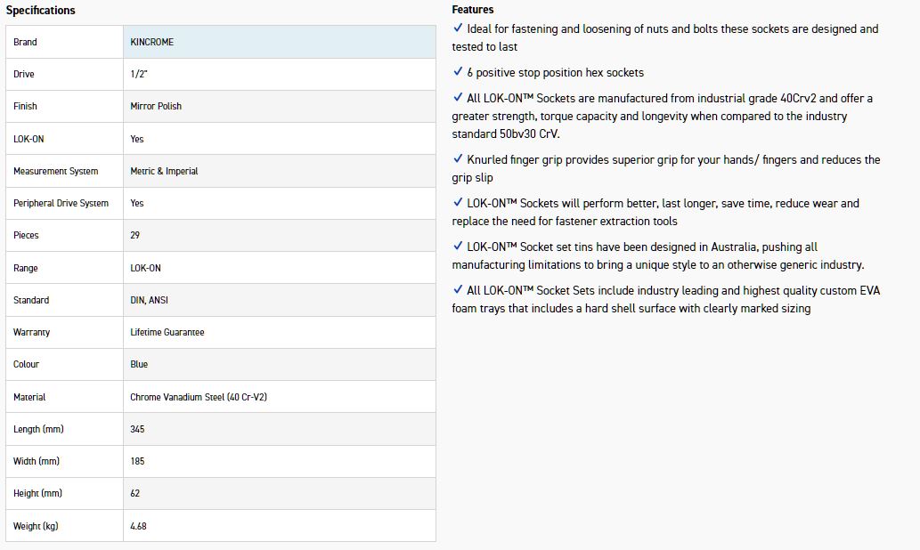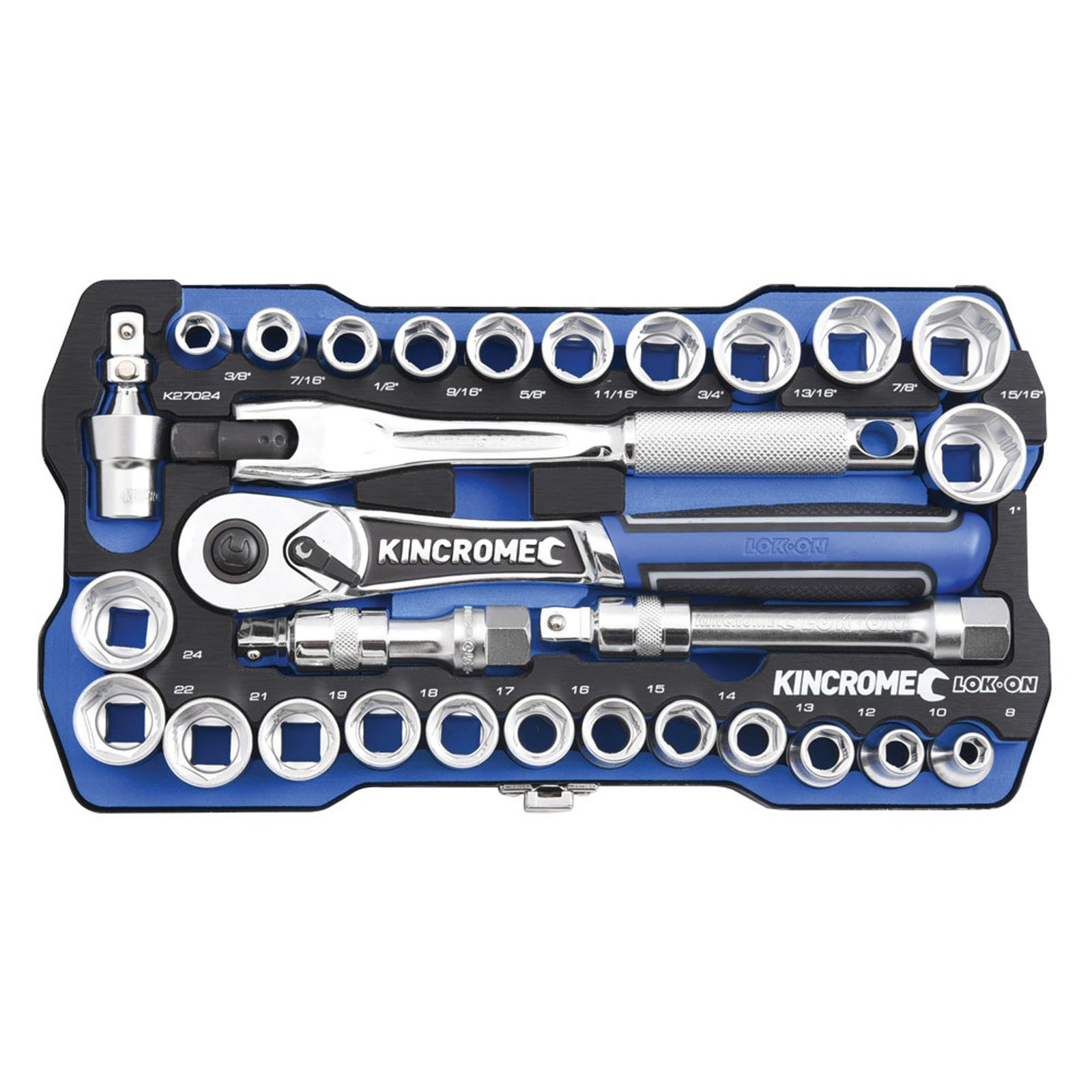 Kincrome LOK-ON™ Sockets, Sets and Accessories have been engineered beyond world-class benchmarks, exceeding all international torque and lifetime standards. Offering unique patented features such as the LOK-ON™ Socket’s ability to loosen up to 85% rounded/damaged fasteners, the LOK-ON™ range has been developed with both function and style in mind. Each component within the LOK-ON™ range includes features above and beyond the market’s expectation, setting a new benchmark for the professional quality tool industry