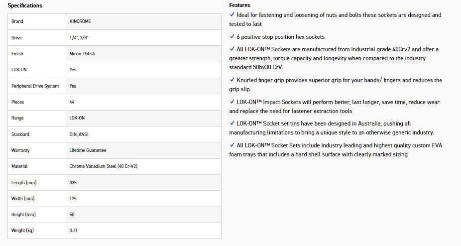 Kincrome LOK-ON™ Sockets, Sets and Accessories have been engineered beyond world-class benchmarks, exceeding all international torque and lifetime standards. Offering unique patented features such as the LOK-ON™ Socket’s ability to loosen up to 85% rounded/damaged fasteners, the LOK-ON™ range has been developed with both function and style in mind. Each component within the LOK-ON™ range includes features above and beyond the market’s expectation, setting a new benchmark for the professional quality tool industry.