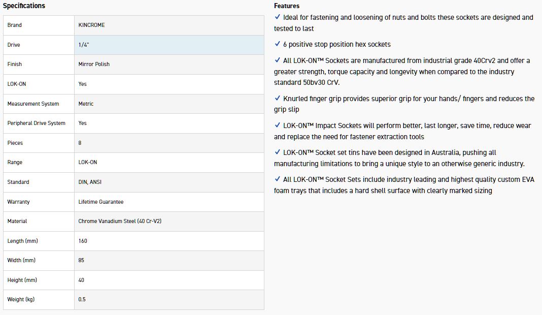 Kincrome LOK-ON™ Sockets, Sets and Accessories have been engineered beyond world-class benchmarks, exceeding all international torque and lifetime standards. Offering unique patented features such as the LOK-ON™ Socket’s ability to loosen up to 85% rounded/damaged fasteners, the LOK-ON™ range has been developed with both function and style in mind. Each component within the LOK-ON™ range includes features above and beyond the market’s expectation, setting a new benchmark for the professional quality tool industry.