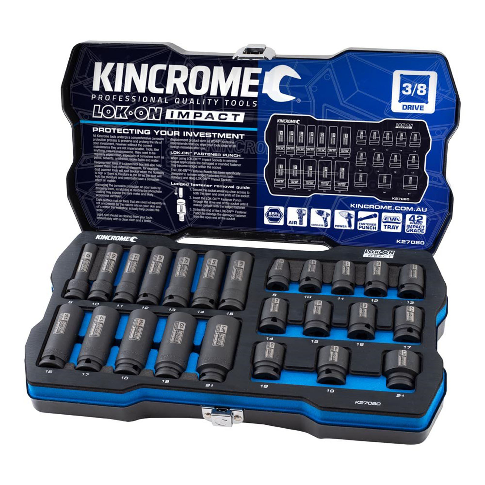 Kincrome LOK-ON™ Impact Sockets and Sets have been engineered beyond world-class benchmarks, exceeding all international torque and lifetime standards. Offering unique patented features such as LOK-ON™ Socket’s ability to loosen up to 85% rounded/ damaged fasteners, the LOK-ON™ range has been developed with both function and style in mind. Each component within the LOK-ON™ range includes features above and beyond the market’s expectation, setting a new benchmark for the professional quality tool industry.