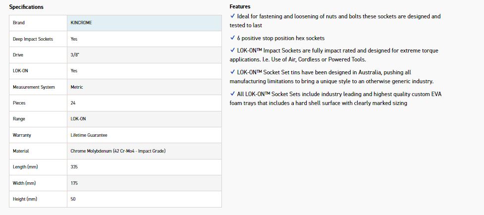 Kincrome LOK-ON™ Sockets, Sets and Accessories have been engineered beyond world-class benchmarks, exceeding all international torque and lifetime standards. Offering unique patented features such as the LOK-ON™ Socket’s ability to loosen up to 85% rounded/damaged fasteners, the LOK-ON™ range has been developed with both function and style in mind. Each component within the LOK-ON™ range includes features above and beyond the market’s expectation, setting a new benchmark for the professional quality tool industry.