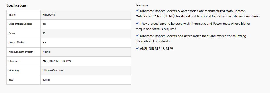 Kincrome Impact Sockets & Accessories are manufactured from Chrome Molybdenum Steel (Cr-Mo), hardened and tempered to perform in extreme conditions