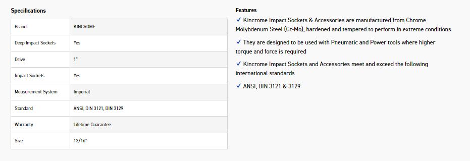 Kincrome Impact Sockets & Accessories are manufactured from Chrome Molybdenum Steel (Cr-Mo), hardened and tempered to perform in extreme conditions