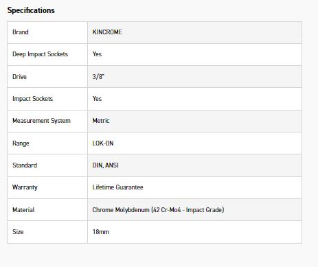 KINCROME K27190 LOKON IMP SKT DEEP 3/8DRV 18MM