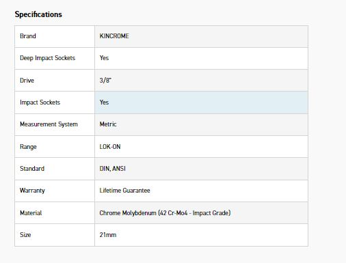 KINCROME K27193 LOKON IMP SKT DEEP 3/8DRV 21MM