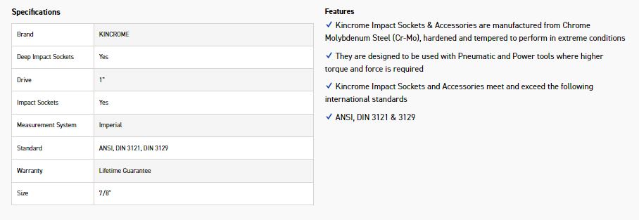 Kincrome Impact Sockets & Accessories are manufactured from Chrome Molybdenum Steel (Cr-Mo), hardened and tempered to perform in extreme conditions