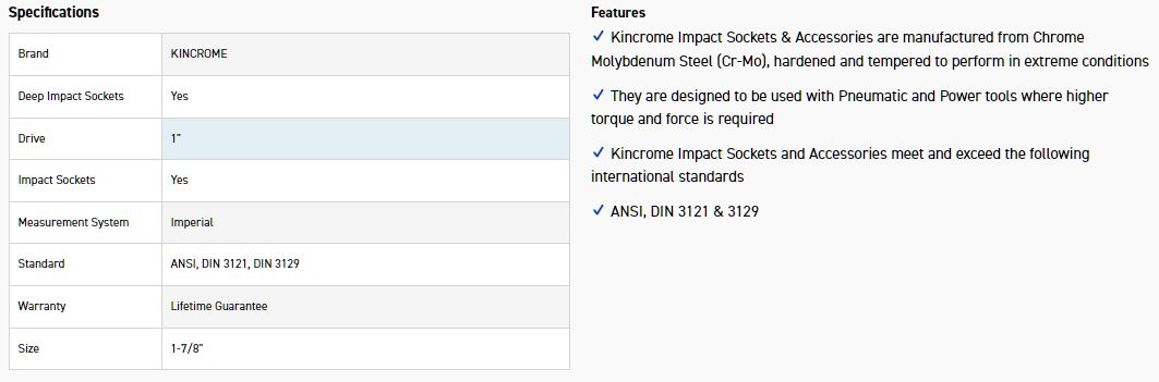 Kincrome Impact Sockets & Accessories are manufactured from Chrome Molybdenum Steel (Cr-Mo), hardened and tempered to perform in extreme conditions