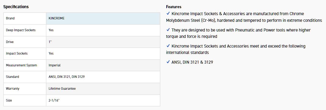 Kincrome Impact Sockets & Accessories are manufactured from Chrome Molybdenum Steel (Cr-Mo), hardened and tempered to perform in extreme conditions