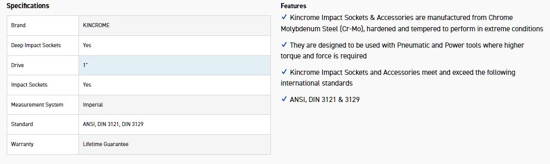 Kincrome Impact Sockets & Accessories are manufactured from Chrome Molybdenum Steel (Cr-Mo), hardened and tempered to perform in extreme conditions
