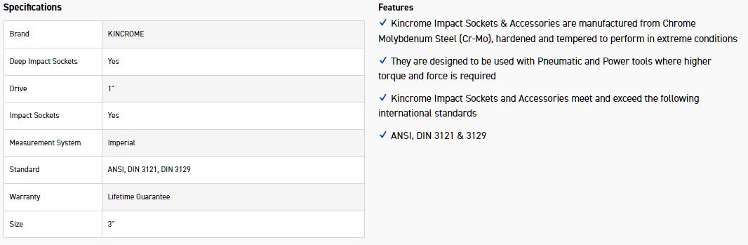 Kincrome Impact Sockets & Accessories are manufactured from Chrome Molybdenum Steel (Cr-Mo), hardened and tempered to perform in extreme conditions