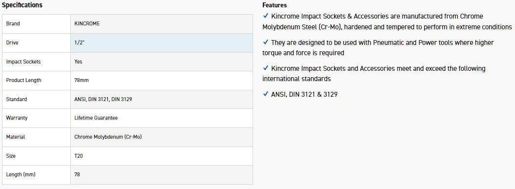 Kincrome Impact Sockets & Accessories are manufactured from Chrome Molybdenum Steel (Cr-Mo), hardened and tempered to perform in extreme conditions
