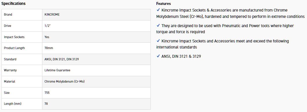 Kincrome Impact Sockets & Accessories are manufactured from Chrome Molybdenum Steel (Cr-Mo), hardened and tempered to perform in extreme conditions