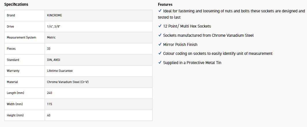 KINCROME K28015 SKT SET 33P 1/4 & 3/8 DR MET
