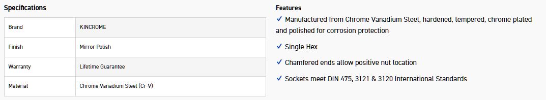 Manufactured from Chrome Vanadium Steel, hardened, tempered, chrome plated and polished for corrosion protection