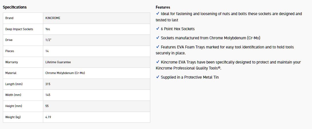 Kincrome’s range of impact sockets are manufactured from Chrome Molybdenum (Cr-Mo) and feature a black phosphate finish for superior corrosion protection, laser etching foreasy drive size identification and Peripheral Drive™ technology. Peripheral Drive™ provides greater torque by relocation the load to the flat sides of a fastener, this allows for greater surface area contact and prevents “rounding off” of fasteners. IMPORTANT: Only Impact Sockets should be used on air or electrically operated power tools. NEVER use silver Chrome Vanadium Steel (Cr-V) Sockets which can shatter and cause personal injury.