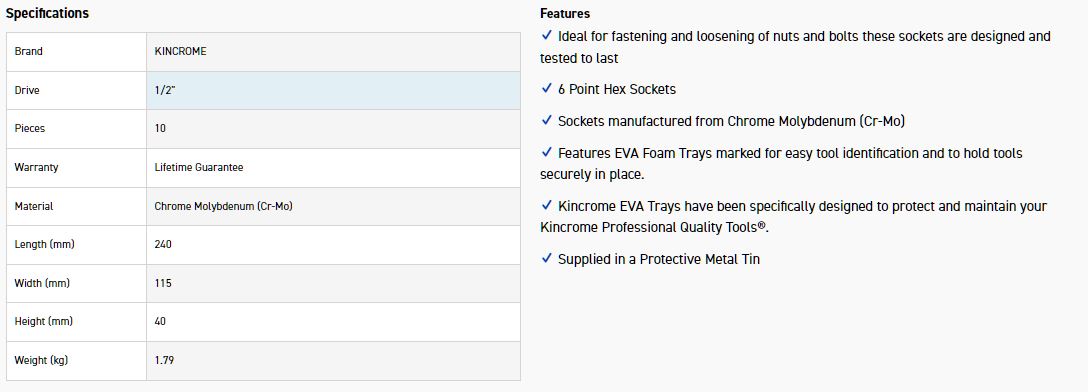Kincrome’s range of Hex impact sockets are manufactured from Chrome Molybdenum (Cr-Mo) and feature a black phosphate finish for superior corrosion protection and laser etching for easy drive size identification. Chrome Molybdenum is an industrial grade material designed for impact and extreme torque applications. Hex Impact sockets are designed to withstand the high torque and force associated with impact tools in repetitive application and can be used on stubborn fasteners. IMPORTANT: Only Impact Sockets should be used on air or electrically operated power tools. NEVER use silver Chrome Vanadium Steel (Cr-V) Sockets which can shatter and cause personal injury.