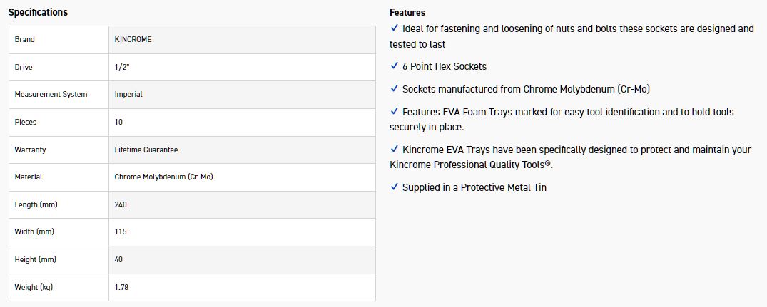 Kincrome’s range of Hex impact sockets are manufactured from Chrome Molybdenum (Cr-Mo) and feature a black phosphate finish for superior corrosion protection and laser etching for easy drive size identification. Chrome Molybdenum is an industrial grade material designed for impact and extreme torque applications. Hex Impact sockets are designed to withstand the high torque and force associated with impact tools in repetitive application and can be used on stubborn fasteners. IMPORTANT: Only Impact Sockets should be used on air or electrically operated power tools. NEVER use silver Chrome Vanadium Steel (Cr-V) Sockets which can shatter and cause personal injury.