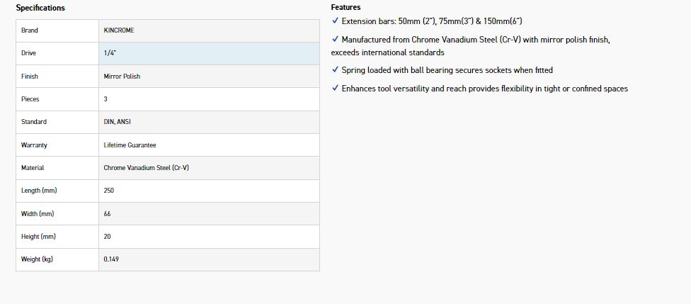Extension bars: 50mm (2''), 75mm(3'') & 150mm(6'')