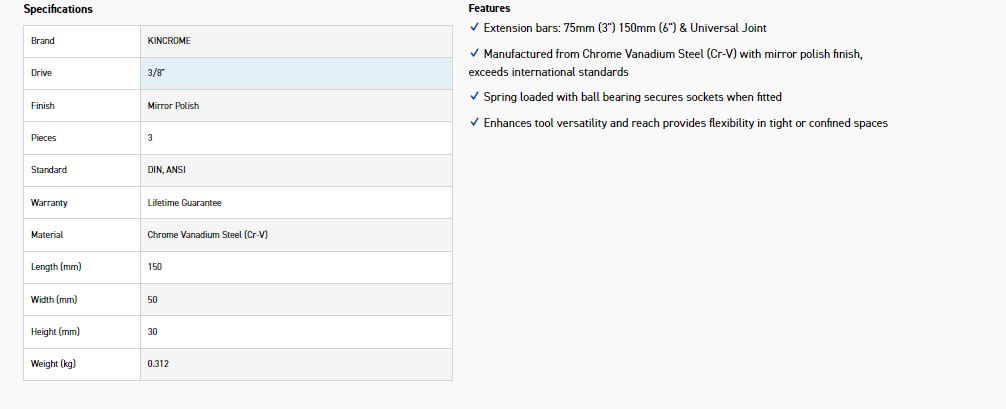 Extension bars: 75mm (3'') 150mm (6'') & Universal Joint