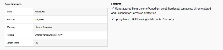 Manufactured from chrome Vanadium steel, hardened, tempered, chrome plated and Polished for Corrosion protection