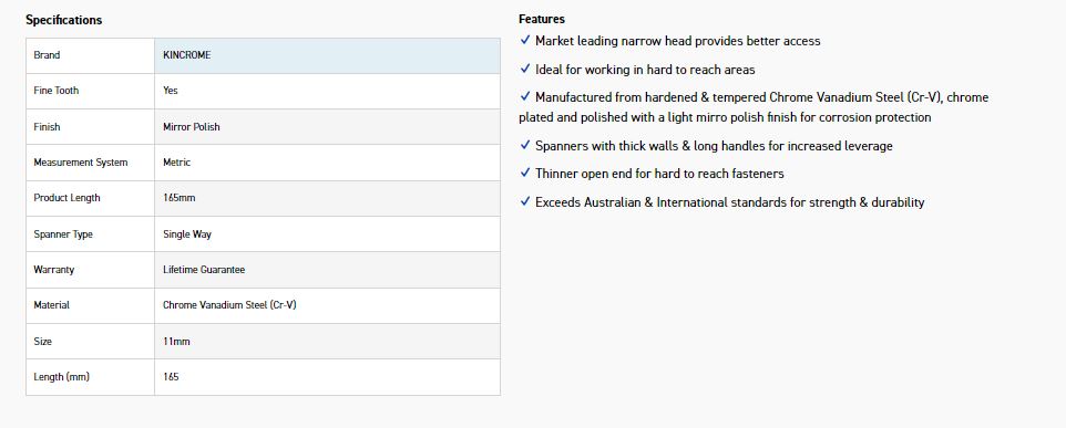 The Kincrome single way gear spanner has all the benefits of standard spanners and more. The strong fine gear ratcheting ring end needs as little as 2.5° of sweep to move the fastener, a standard fixed ring end needs a minimum of 30°, or 12 times the area. Kincrome Gear Spanner ratcheting ring end has a Peripheral Drive™ configuration that virtually eliminates the rounding off of fasteners.