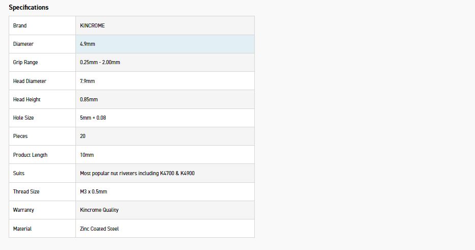 Home » Shop » HAND TOOLS » PLIERS & WRENCHES » KINCROME K4953 RIVNUT ZINC STEEL M3 20 PIECE