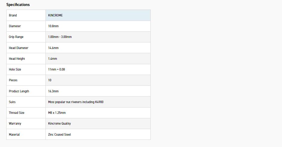 Home » Shop » HAND TOOLS » PLIERS & WRENCHES » KINCROME K4958 RIVNUT ZINC STEEL M8 10 PIECE