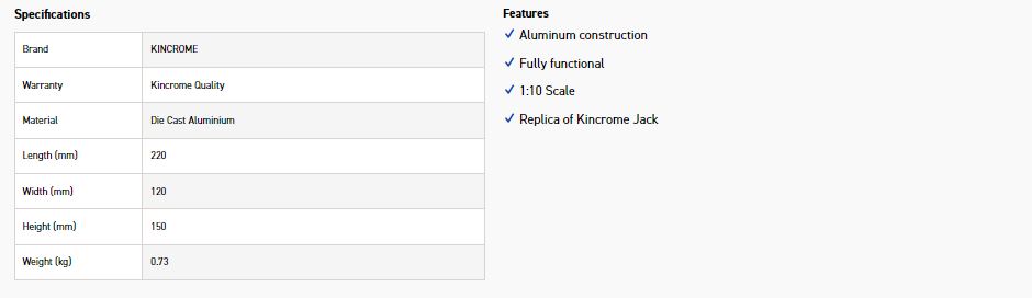 The limited Edition Kincrome Mini Trolley Jack is a 1:10 scale fully functioning display unit. Made from Aluminium it has all the components its other larger Kincrome jacks have. Perfect for the Office, Desk or on display you can’t go wrong!** This is a Toy / Display Product ONLY and not made for lifting purposes**