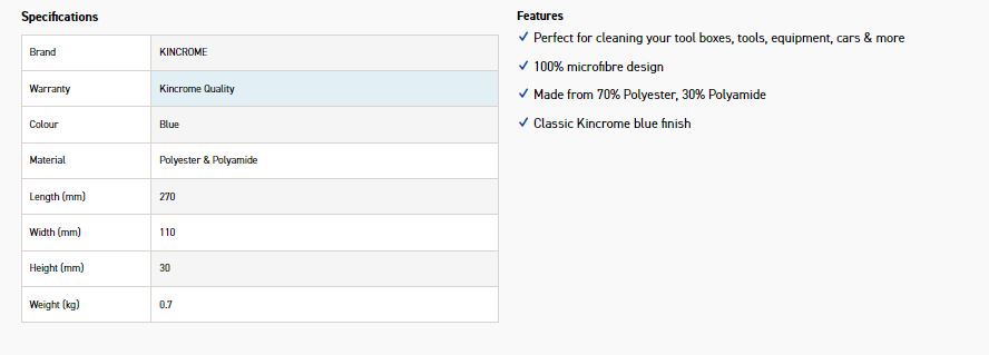 The Kincrome Microfibre Cloth is a soft, durable solution for applications around the house, office, garage or workshop.
