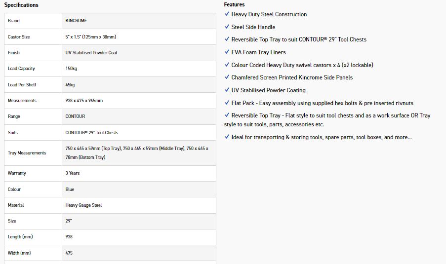 CONTOURĀ® storage comes standard with a range of premium features, including; the chamfered screen printed Kincrome side panels, ’Automatic Drawer Retention System (ADRS)’ locking system, heavy duty steel side handles, side folding work trays (including magnetic power boards), stainless steel worktops & heavy duty swivel castors for easy manoeuvrability.
