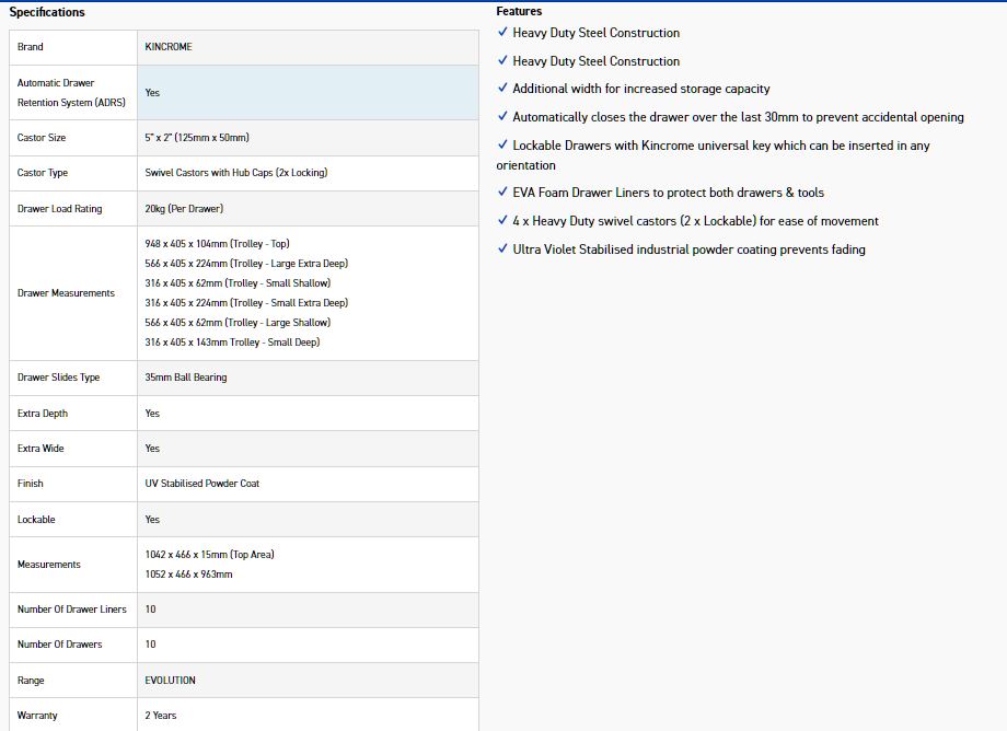 The EVOLUTION Range of Storage and Toolkits has been developed for the trade professional wanting value for money without compromising quality. EVOLUTION is loaded with premium features and trade tough tools for the professional user, but at a price not out of reach of the home user. Designed in Australia by Kincrome, the EVOLUTION range offers a storage or complete tool kit solution, for the serious home user, apprentice and trade professional.