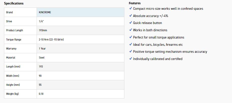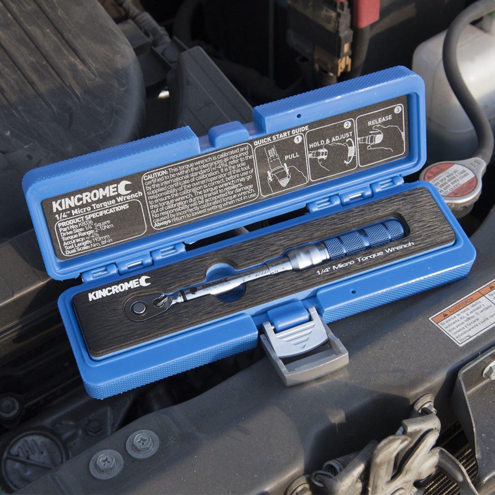 The Kincrome Micrometer Torque Wrench is a must have for anyone who requires the ultimate in accuracy in small torque applications. Whether you’re working on your car, motorcycle, firearm or bicycle (including carbon) the Kincrome Micrometer Torque Wrench is capable of applying torque settings in BOTH directions with an accuracy of a certified +/-4%. The Kincrome Micrometer Torque Wrench is a click type style torque wrench and is small in size, allowing for usage in hard to reach places. It features an impressive torque range of 2-10N·m (13.3-93.3 lbf·in) and is equipped with a locking collar which allows the torque wrench to apply torque settings in decimal graduations (eg. 2.1N·m – 9.9N·m) to reach the torque required. Each unit is individually calibrated, certified and housed within a convenient blow mould case and features EVA Padding internally to keep your Torque Wrench protected.