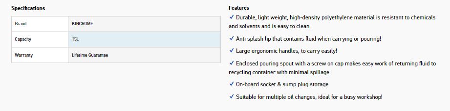 The Kincrome 15L Oil Drain Pan is a must have for any workshop or car enthusiast! The anti-splash design means there’s no down time cleaning up dirty oil spills, which can be extremely dangerous in your working environment!