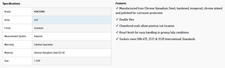 KINCROME KC120C SOCKET 3/4 DRV 1.3/8″