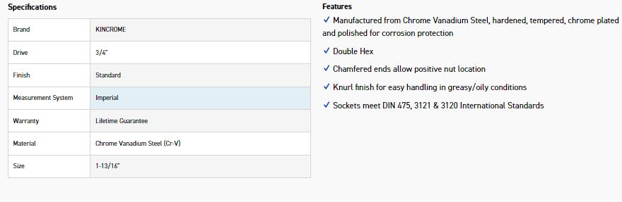 KINCROME KC127C SOCKET 3/4 DRV 1.13/16″
