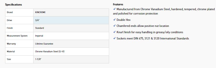KINCROME KC128C SOCKET 3/4 DRV 1.7/8″
