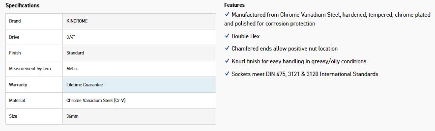 KINCROME KC138C SOCKET 3/4 DRV 36MM