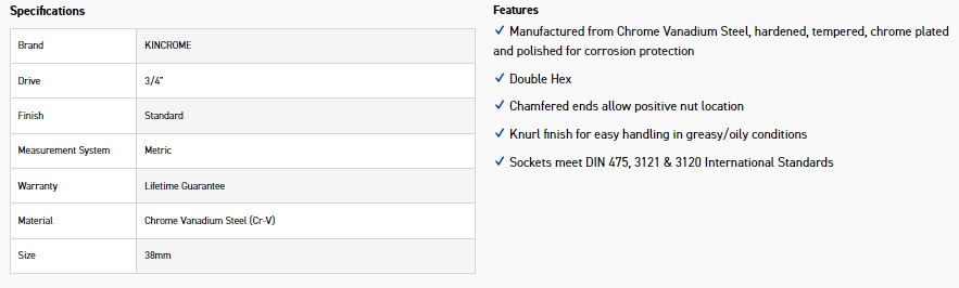 KINCROME KC139C SOCKET 3/4 DRV 38MM
