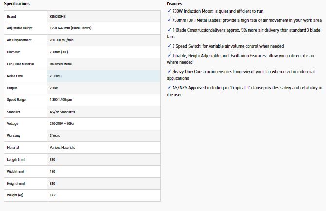 750mm (30″) Metal Blades: provide a high rate of air movement in your work area